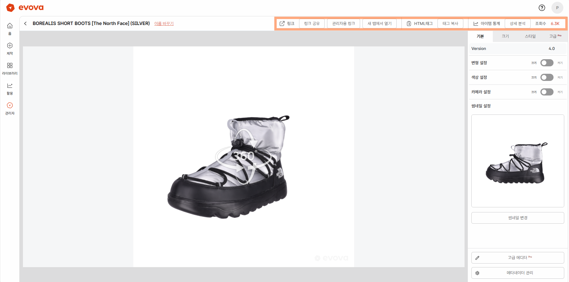 - 화면의 우측 상단에는 제품 링크 공유, 새탭에서 열기, HTML 태그 복사, 통계 분석 등의 버튼이 위치합니다.