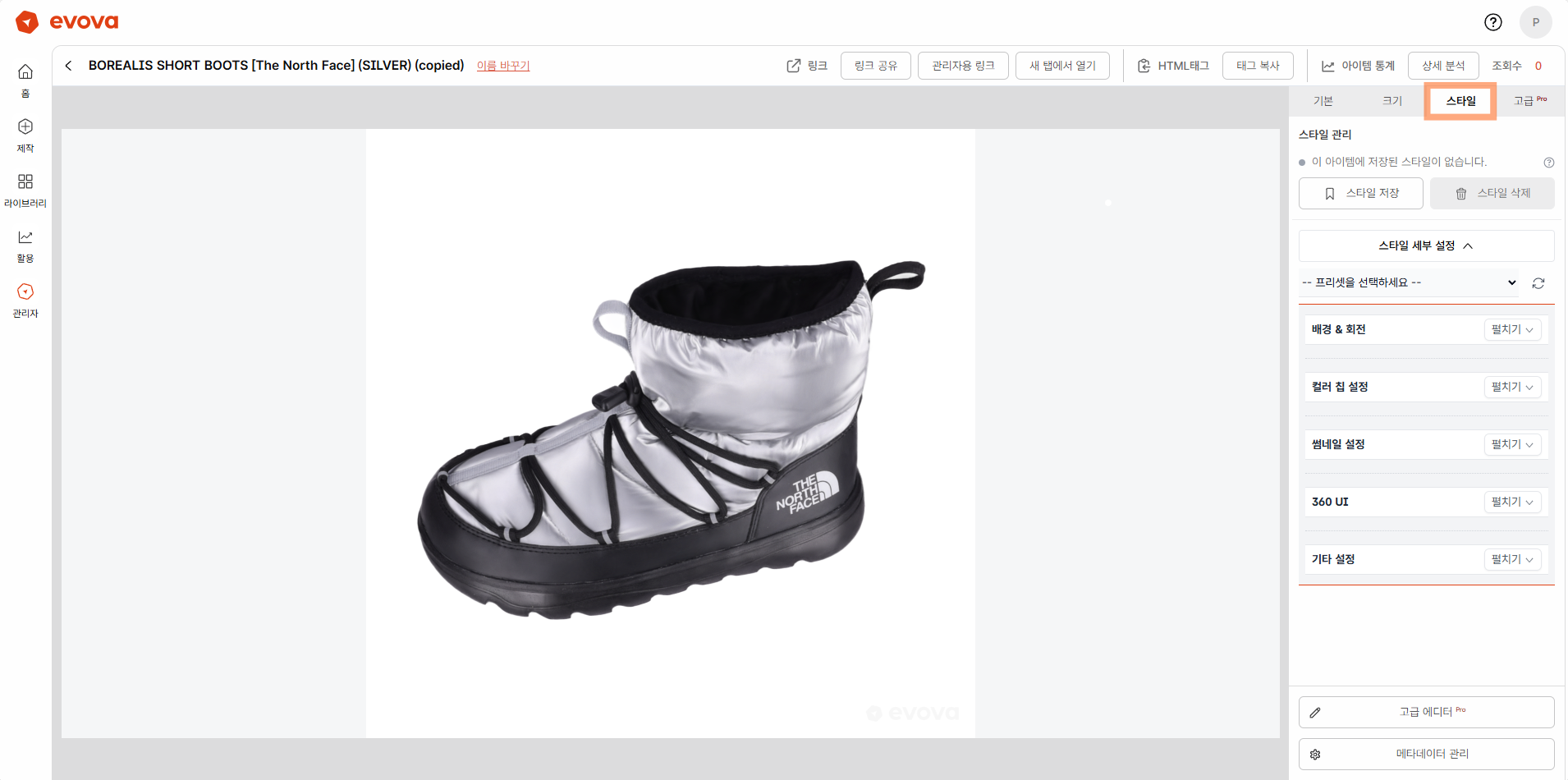 - [스타일 저장] 버튼: 현재 제품에 설정된 모든 스타일을 저장합니다