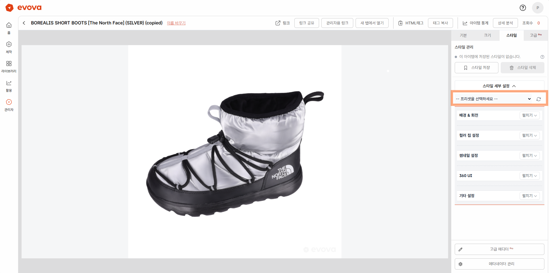 스타일 설정은 프리셋 추가하기 기능을 통해 브랜드 관리자 간 내부 공유가 가능하며, 한 번 저장해두면 다른 제품에도 손쉽게 동일한 설정을 적용할 수 있습니다.