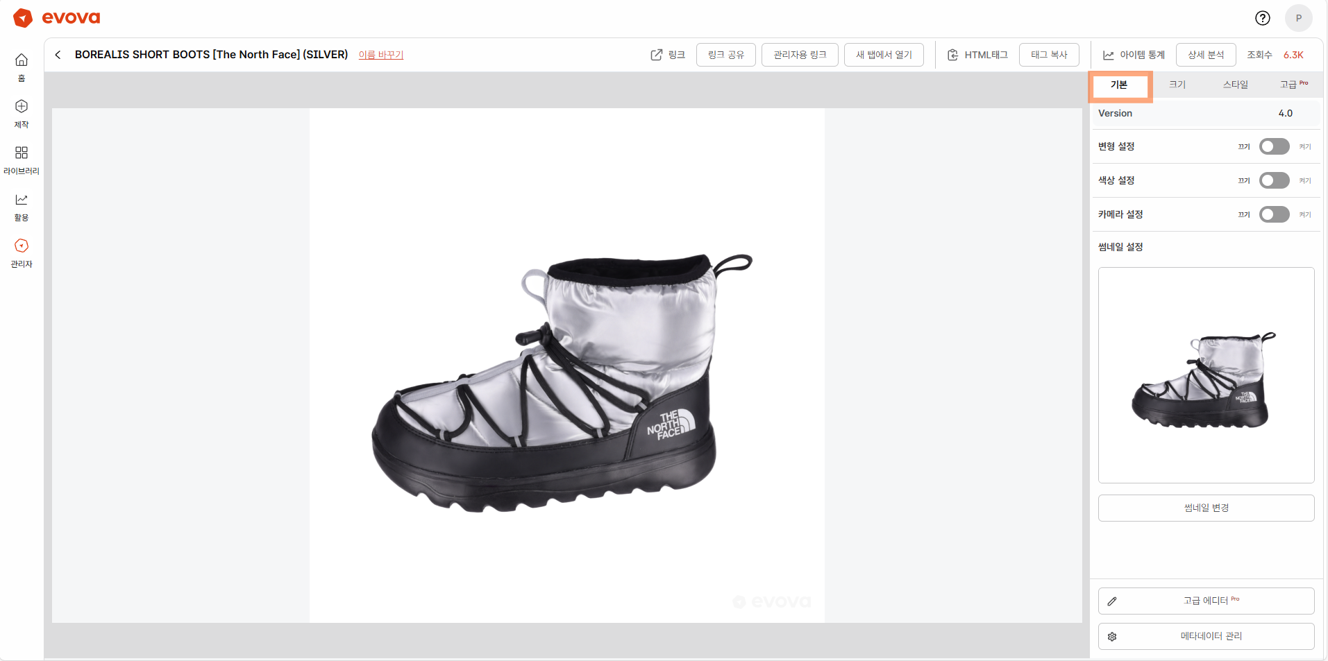 - 3D 모 델 크기: 화면에 보이는 제품의 전체 크기를 조정