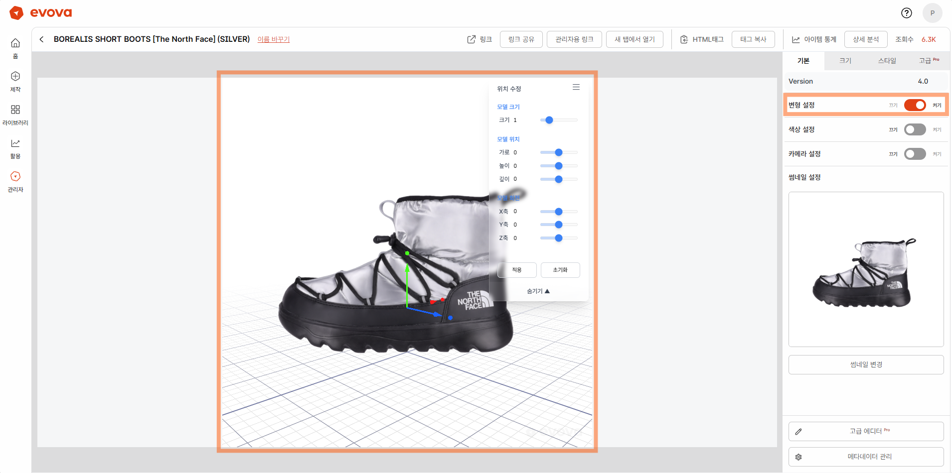 - 3D 모델 위치: 제품을 가로(X) / 높이(Y) / 깊이(Z) 방향으로 이동