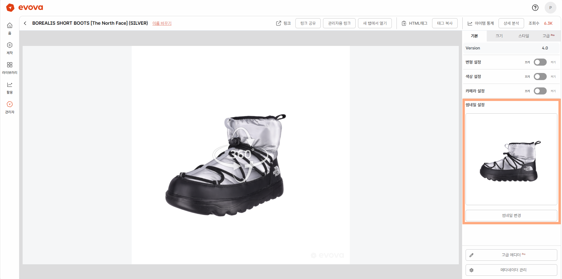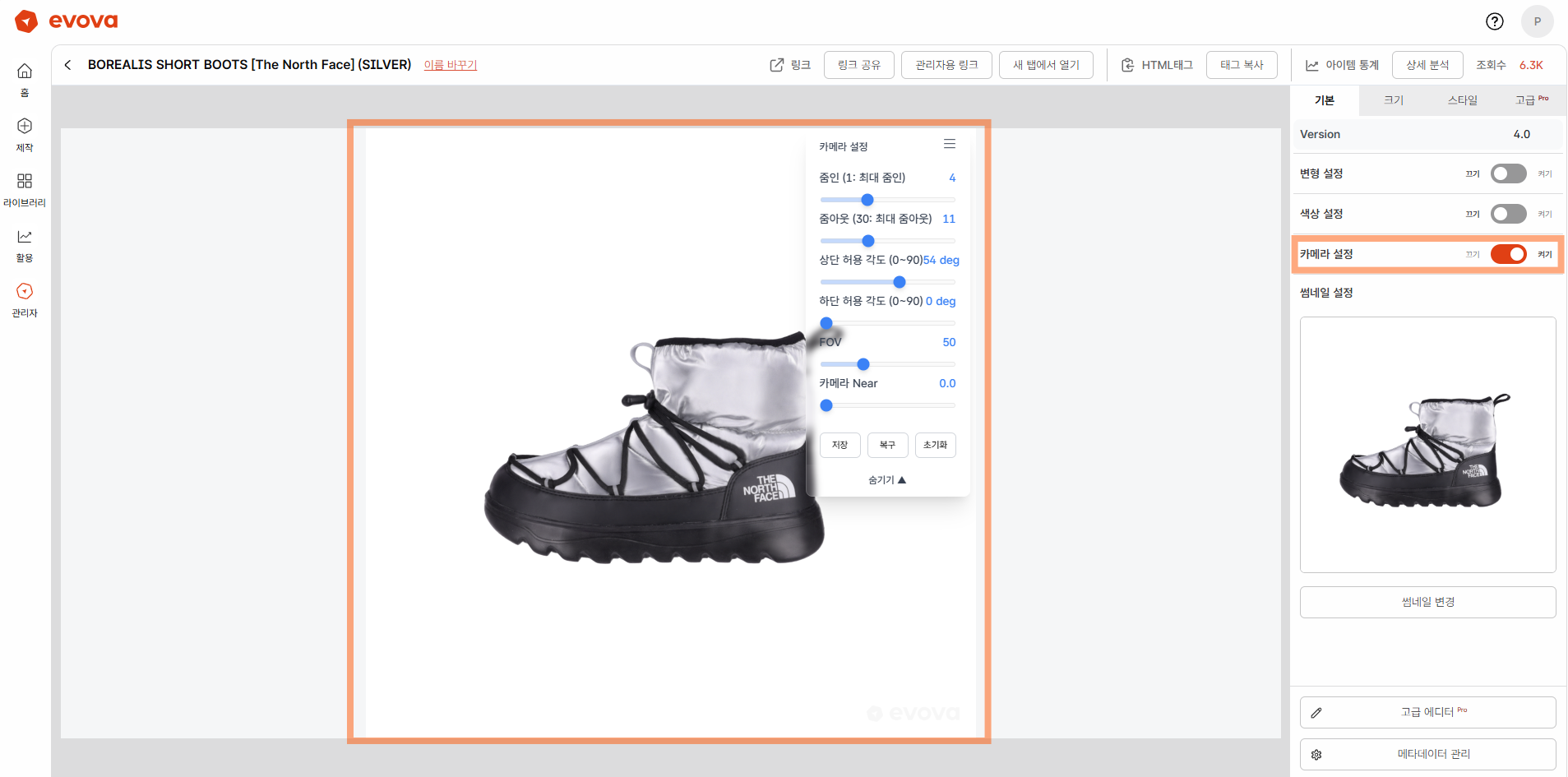 - 3D 모델 회전: X, Y, Z축 기준으로 제품을 회전시켜 정면 또는 원하는 각도로 조정