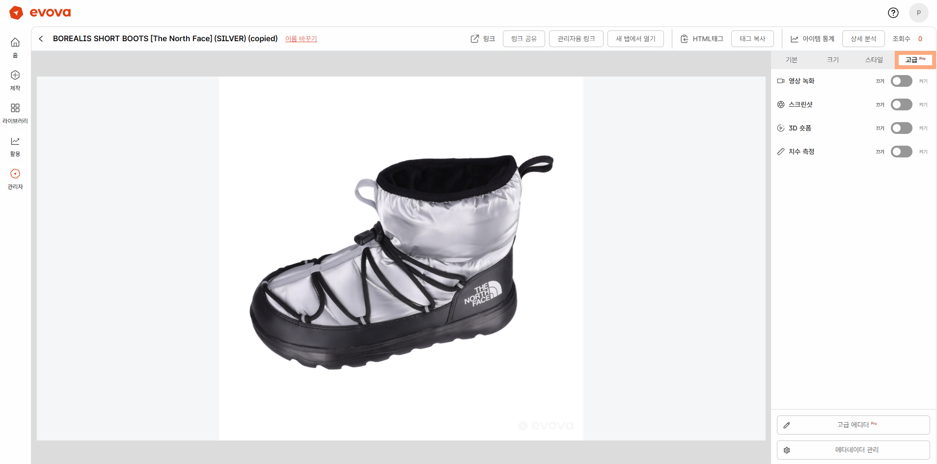 좌측 사이드바 > [라이브러리] > 아이템 선택 > 우측 사이드바 [고급] 클릭