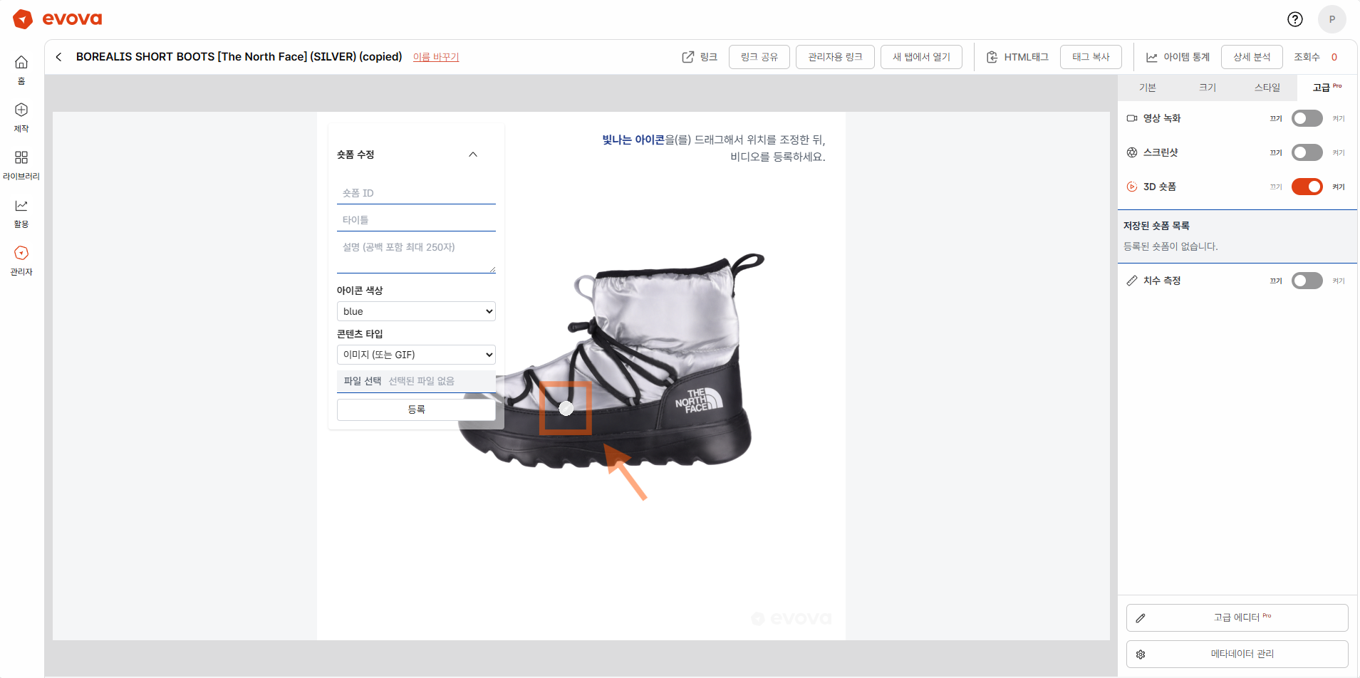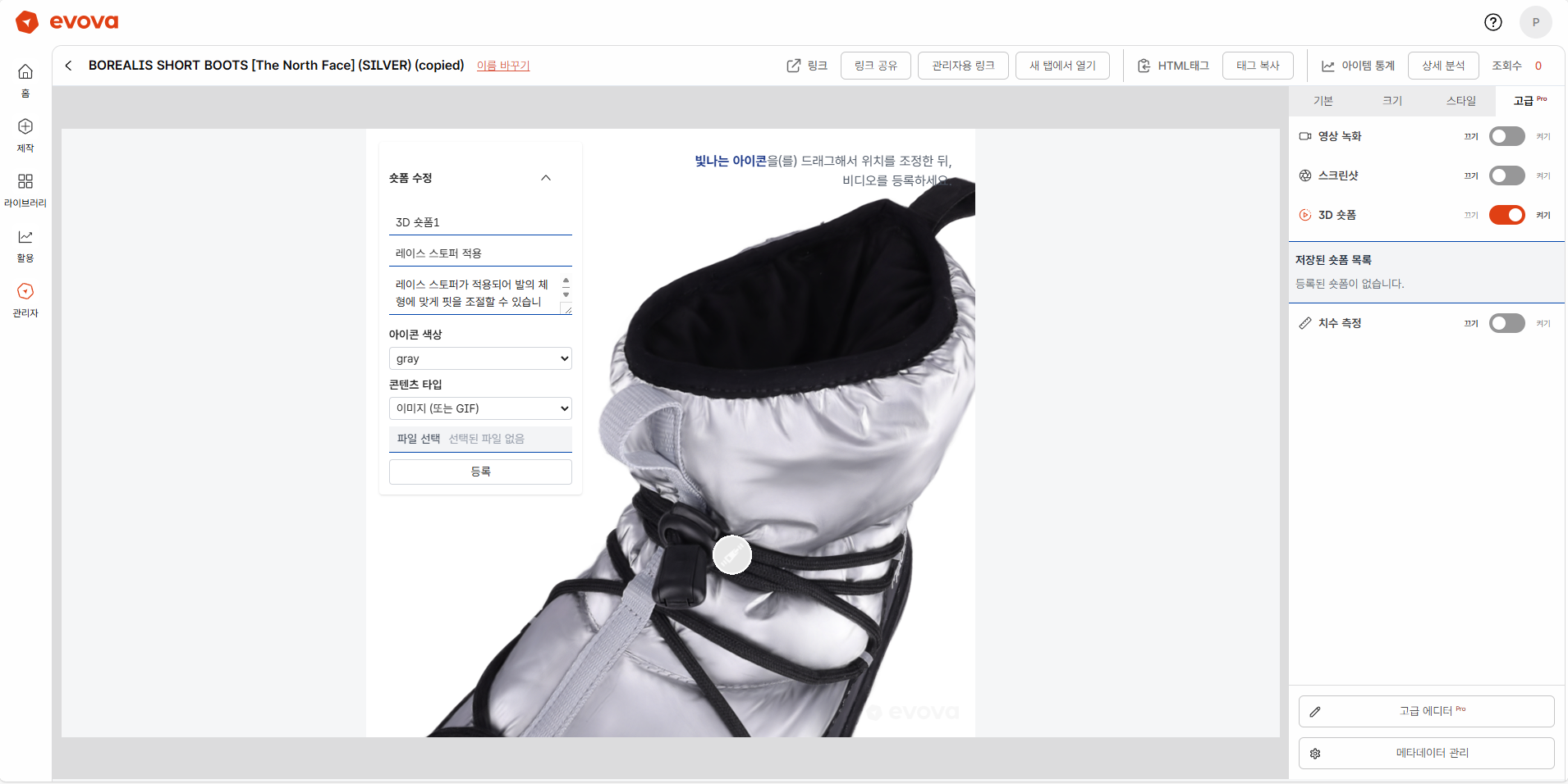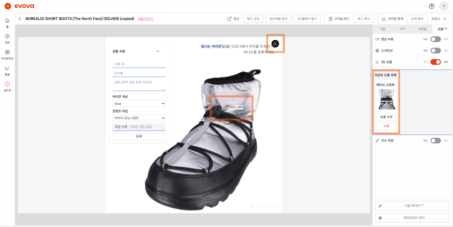 EVOVA의 3D 뷰어에서 브랜드가 설정한 영상, 이미지, GIF 등의 콘텐츠를 아이콘 형태로 삽입할 수 있습니다.